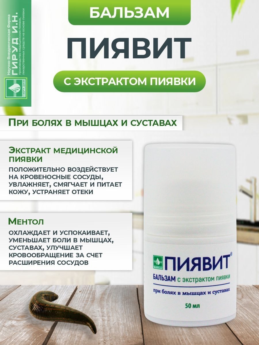 Бальзам товарного знака «Пиявит®» (немедикаментозное средство) представляет собой гелеобразную структуру от прозрачного до серовато-желтого цвета. Бальзам "Пиявит» оказывает местное анестезирующее, противовоспалительное, противоотечное, антисклеротическое, общеукрепляющее действие.