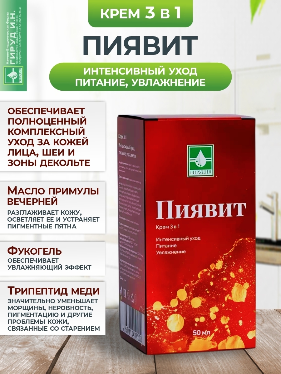 Крем косметический для лица «Пиявит»® 3 в 1 с экстрактом пиявки предназначен для интенсивного ухода, питания и увлажнения кожи. Активные компоненты входящие в состав крема обеспечивают полноценный комплексный уход за кожей лица, шеи и зоны декольте.